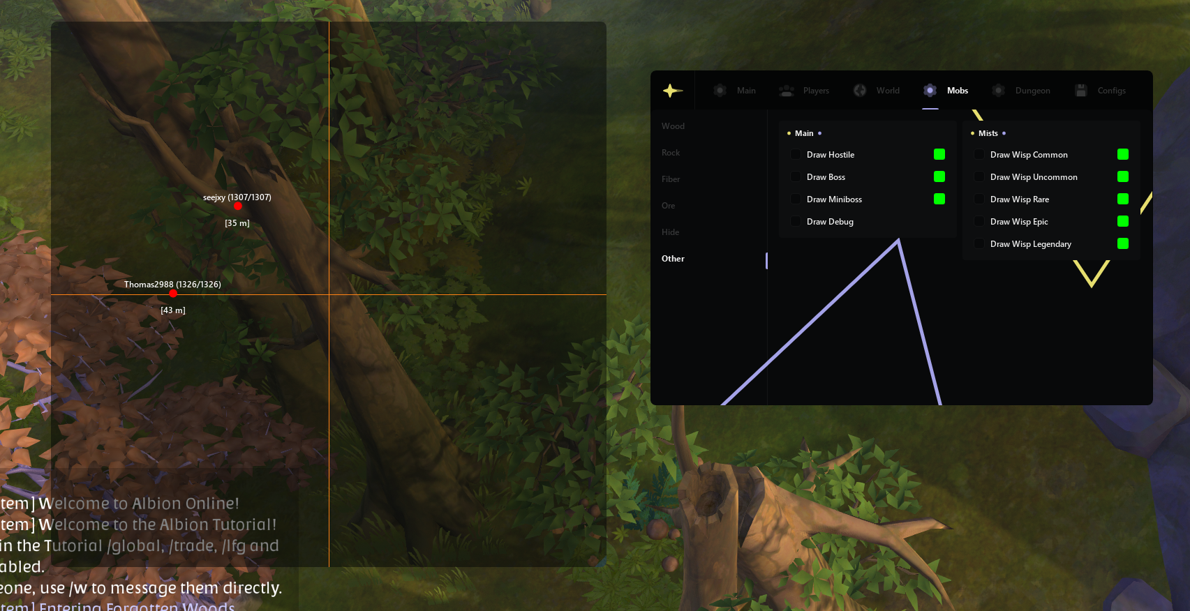 Solo and group dungeons spawn throughout the open world providing Fame farming and loot opportunities. Our ESP displays all mob positions including health, tier, and type. Track dungeon entrances, boss locations, and treasure chest spawns. Identify which mobs guard valuable resources before engaging. See exact health values to calculate whether fights are winnable with your current gear.